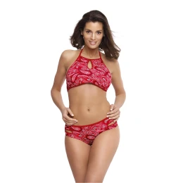 Módne a zaujímavé dvojdielne plavky so zabudovaným horným dielom. Je vyrobený zo vzorovanej matnej tkaniny. Spodná časť podprsenky má tvarované trojuholníkové košíčky, vystužené penou a doplnené push-up, takže poprsie je správne nabrané a modelované. Push-up sa dodáva v každej veľkosti plaviek a nie je z modelu snímateľný. Podprsenka sa pohodlne zaväzuje na chrbte a za krkom. Nohavičky majú zvodné bočné záhyby. Vpredu sú vzorované, vzadu hladké a majú správnu výšku (ani príliš nízku, ani príliš vysokú), takže sa hodí na pláž. Športový štýl s nádychom etna...