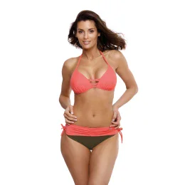 Dvojdielne plavky z kolekcie Leto 2019 ušité z talianskej látky. Podprsenka s košíčkami vystuženými jemnou penou, s push-upkou trvale umiestnenou v modeli (nie je možné ju vybrať), krásne zhromažďuje prsia, približuje ich k sebe a opticky ich zväčšuje, čím zrazu vytvára hlboký, zmyselný dekolt. Popruhy uprostred tento sexy dojem ešte umocňujú. Push-up sa dodáva v každej veľkosti modelu. Podprsenka sa zaväzuje za krkom aj na chrbte. Súčasťou sady sú nohavičky s ozdobnými viazačkami na bokoch, ktoré sú tradične vsadené (viazačky sú ozdobným prvkom). Elegantné farby, ktoré dokonale zodpovedajú letnej klíme.
