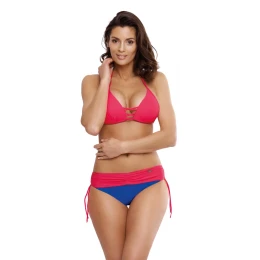 Dvojdielne plavky z kolekcie Leto 2019 ušité z talianskej látky. Podprsenka s košíčkami vystuženými jemnou penou, s push-upkou trvale umiestnenou v modeli (nie je možné ju vybrať), krásne zhromažďuje prsia, približuje ich k sebe a opticky ich zväčšuje, čím zrazu vytvára hlboký, zmyselný dekolt. Popruhy uprostred tento sexy dojem ešte umocňujú. Push-up sa dodáva v každej veľkosti modelu. Podprsenka sa zaväzuje za krkom aj na chrbte. Súčasťou sady sú nohavičky s ozdobnými viazačkami na bokoch, ktoré sú tradične vsadené (viazačky sú ozdobným prvkom). Elegantné farby, ktoré dokonale zodpovedajú letnej klíme.