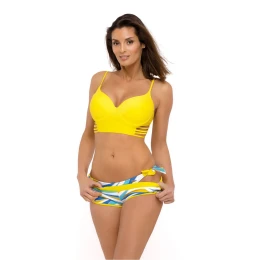 Úplná novinka! Trojdielne plavky s podprsenkou, ktorá pripomína zmyselný polokorzet. A dva páry vzorovaných nohavičiek. Aké sú tieto plavky? Je to ženskosť a pohodlie v sexi prostredí. Podprsenka má vystužené, profilované košíčky, obohatené o kostice aj push-up, vďaka ktorým nádherne pozdvihne prsia, priblíži ich k sebe a silne ich zväčší, čím vytvorí hlboký, zvodný dekolt. Push-up sa dodáva vo všetkých veľkostiach a nie je možné ho z plaviek vybrať. Na bokoch podprsenky sú elastické ramienka, ktoré jej dodávajú charakter. Elastický pásik sa vzadu zapína na pracku. K tomu zvodný spodný diel bikín so zaväzovaním na bokoch a šortkami v ľahko športovom štýle. Ide o fenomenálnu sadu, ktorú stojí za to objednať. Krásne farby. Vynikajúca kvalita (plavky sú vyrobené z talianskej tkaniny).