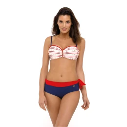 Pohodlné dvojdielne plavky so vzorovanou podprsenkou a mierne vyššími, pohodlnými nohavičkami. Vyrobené z talianskej tkaniny v krásnych farbách. Podprsenka horizontálneho strihu pôsobí ako bardotka, dvíha a vypína prsia a zároveň ich opticky zväčšuje. Konštrukcia je vystužená penou, s kosticami a zabudovaným push-upom (push-up je v každej veľkosti). Podprsenka je ideálna aj na opaľovanie, jej ramienka sú úplne odopínacie. Jednoduchý spodný diel bikín s ozdobným zaväzovaním na bokoch vás na pláži rozhodne nebude obmedzovať.