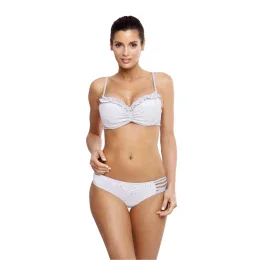 Skvelé dvojdielne plavky, v ktorých potešíte každé oko. Vyrobené z talianskej velúrovej tkaniny. Perleťové a elegantné. Navrhnuté tak, aby telo vyzeralo veľmi atraktívne. Push-up podprsenka s vystuženými košíčkami a kosticami dobre dvíha prsia a približuje ich k sebe, čím vytvára zvodný dekolt. Push-up vypchávky sú prítomné v každej veľkosti plaviek a nie sú z modelu vyberateľné. Vrchná časť je zdobená volánikom, stred podprsenky je ozdobne nariasený. Obvod sa vzadu pohodlne zaväzuje. Za zmienku stojí aj spodný diel - má veľmi dobrý strih (ani príliš nízky, ani príliš vysoký) a vďaka sexy elastickým pásikom na bokoch krásne tvaruje nohy a boky. Rezervujte si tieto plavky pre seba, pretože stoja za to!