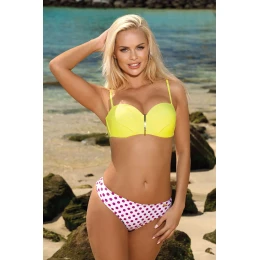 Elegantné plavky so štipkou prázdninovej ľahkosti. Súprava obsahuje hladkú podprsenku, uprostred mierne stiahnutú, s krásnou brošňou v zlatej farbe a samozrejme veľkou push-upkou, kombinovanou so sexy brazílskymi nohavičkami.