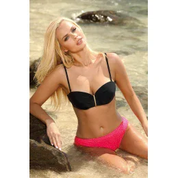 Elegantné plavky so štipkou prázdninovej ľahkosti. Súprava obsahuje hladkú podprsenku, uprostred mierne stiahnutú, s krásnou brošňou v zlatej farbe a samozrejme veľkou push-upkou, kombinovanou so sexy brazílskymi nohavičkami.