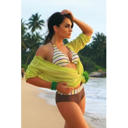 Dvojdielne plavky so šortkami. Farebný pruhovaný model plaviek, trochu športový, ideálny na plávanie alebo opaľovanie. Veľmi pohodlné, polstrované košíčky s vyberateľnými vypchávkami. Popruhy s drobnými bižutérnymi akcentmi. Hladké šortky s ozdobným lemovaním.