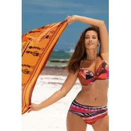 Dvojdielne plavky pre väčšie poprsie s hlbokými a pohodlnými košíčkami. Podprsenka bez push-up, zapínanie na chrbte. Vyššie nohavičky s pohodlným strihom. Strih zakrýva bruško. Vyrobené z talianskej tkaniny Carvico Tessuti. Poľský výrobok. Tip: objednajte si väčšiu veľkosť ako obvykle.