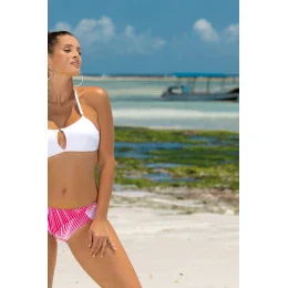 Dvojdielne plavky, ideálne pre malé a stredné poprsie. Podprsenka bez push-up, zaväzuje sa na chrbte. Polstrované košíčky. Popruhy sa zapínajú atypicky, sú nastaviteľné. Nohavičky s pohodlným strihom, podšité. Vyrobené z talianskej tkaniny Carvico Tessuti. Poľský výrobok.