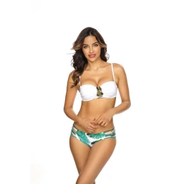 Hladká podprsenka bardotka s kosticami má vystužené košíčky a integrovaný push-up. Ramienka sú odopínacie a nastaviteľné. Zaväzujú sa na chrbte. Vďaka zložitému riaseniu v prednej časti vyzerajú plavky aj napriek jednoduchosti strihu veľmi moderne. Ďalšou ozdobou je odnímateľná brošňa. Súpravu dopĺňa veľmi pôsobivý spodný diel s motívom exotických rastlín. Na bokoch majú prepletené šnúrky spojené korálkami.