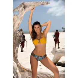 Plavkový kostým s dvoma dielmi je ideálny pre malé a stredné prsia. Podprsenka bez push-upu so zapínaním na chrbte. Košíčky sú vystužené a ramienka sú nastaviteľné. Nohavičky majú pohodlný strih. Ozdoby sú v glamour štýle. Vyrobené z talianskej látky Carvico Tessuti. Poľský výrobok.