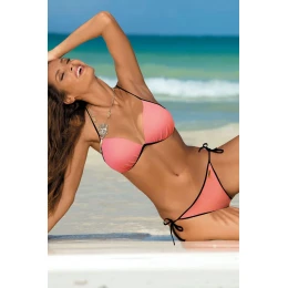 Sexi bikiny, ktoré pripomínajú zmyselné talianske plavky obľúbené hollywoodskymi hviezdami av ktorých budete vyzerať skvele. Vo sviežej farbe s kontrastným lemovaním. Jedny z najlepších plaviek sezóny! Podprsenka s tzv. talianskymi košíčkami je vystužená, s trvalým (neodnímateľným) push-up efektom. Rozhodne pozdvihne poprsie, vytvaruje prsia a opticky ich zväčší. Táto výplň sa nachádza v každej veľkosti podprsenky. Podprsenka sa tradične zaväzuje za krkom aj na chrbte. Nohavičky sa pohodlne zaväzujú na oboch stranách bokov. Tvorí dokonalý duet s podprsenkou a zvodne zdobí boky.