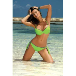 Hladké dvojdielne plavky doplnené vzorovaným lemovaním. A skvelé farby. Veľmi ženské. Košíčky podprsenky sú profesionálne vymodelované a vystužené - dobre zhromažďujú prsia do výstrihu, dvíhajú ich a vďaka podšívke a push výplni ich navyše opticky zväčšujú. Hlboký výstrih - mierne prehĺbený, ale stále veľmi elegantný a vyvážený. Nastaviteľné popruhy. Obvod tentoraz pohodlne uviazaný na chrbte. Nohavičky sa zaväzujú na bokoch. Plavky vyzerajú naozaj skvele. Na pláži vám poskytne plný komfort. Plavky jsou rychleschnoucí, odolné vůči slunečnímu záření (nevyblednou).