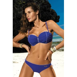 Elegantné dvojdielne plavky s krásnou brošňou uprostred podprsenky. Košíčky sú riadne vystužené, vystužené kosticami a obohatené o push up - zhromažďujú prsia, dobre ich zdvíhajú, udržujú ich v správnej polohe a sexuálne ich zväčšujú. Push up je k dispozícii od veľkosti S do XL vrátane, je možné ho z modelu vybrať. Veľmi pekná línia podprsenky poteší svojim šarmom. Výstrih tu vyzerá skutočne fenomenálne. Jemné ozdobné lemovanie na hladkej tkanine. Popruh je možné odopnúť, čo umožňuje rovnomerné opálenie ramien, majú nastaviteľnú dĺžku. Elastický obvod, zapínanie na pracku. Nohavičky sú elastické s bočnými šnúrkami, takže si môžete nastaviť šírku bokov – od tradičných až po viac sexi... Voľba je na vás, pre nás je to hit! Rozhodne odporúčame!