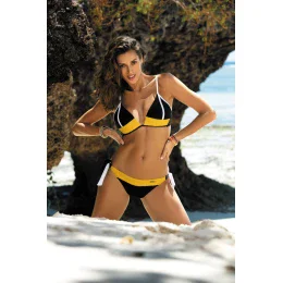 Módne dvojdielne plavky v bikinovom strihu. Košíčky sú zospodu vystužené, majú bočnú podšívku a pevnú (neodnímateľnú) push-up výplň. Dokonale tvarujú, zdvíhajú a opticky zväčšujú prsia. Vytvárajú zvodný výstrih. Veľmi pekne zladené farby robia dojem. Dve látky – hladká a mierne lisovaná – jej dodávajú zaujímavý charakter a odlišujú ju od ostatných. Obvod sa zapína sponou. Popruhy uviazané pri krku. Nohavičky pohodlne zaviazané na oboch stranách bokov – to najlepšie. Celok pôsobí elegantne, žensky, sexy a moderne. A dokonale zdobia telo. Vrelo odporúčame!
