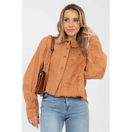 Elegantná dámska džínsová bunda v ležérnom štýle, ideálna na každý deň. Je vyrobená z kvalitnej bavlny, poskytuje pohodlný strih a všestranný charakter. Model s krátkou dĺžkou, klasickým golierom a dlhými rukávmi, zapínanie na gombíky. Spodný okraj bundy je ukončený moderným ripsom, ktorý celku dodáva mierne rockový akcent. Vyšívané kvety umiestnené na ľavej strane bundy na prednej strane, rukávoch a chrbte dodávajú originalitu, vytvárajú efektný a ženský detail. Praktické vrecko na pravej strane na úrovni hrudníka zdôrazňuje úžitkový charakter modelu. Skvelá voľba na každodenný outfit, tak k šatám, ako aj k džínsom alebo sukni.