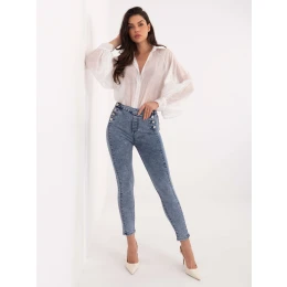Modré skinny džínsy s ozdobnými gombíkmi.