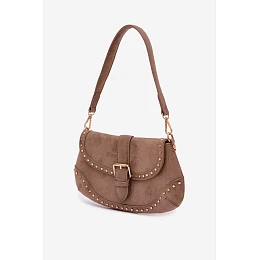 Malá dámská kabelka vyrobená z eko semiše. Její kompaktní rozměr ji činí ideální na každý den i na výlety, když potřebujete mít u sebe pouze nejdůležitější věci. Model má klapku zapínanou na magnetický klips, což zajišťuje pohodlí při používání. Kabelka je ozdobena zlatými nýty, které jí dodávají výrazný a moderní styl. Součástí jsou dva odnímatelné pásky – kratší na nošení přes rameno a delší, nastavitelné, umožňující nošení přes rameno. Uvnitř je kapsa na zip, ideální na drobnosti vyžadující dodatečné zabezpečení. Rozměry: šířka - 27 cm, výška - 16 cm, tloušťka - 3 cm.