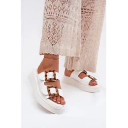 Eko Skórzane Klapki Damskie Na Platformie Z Klamrami Białe Xanivia