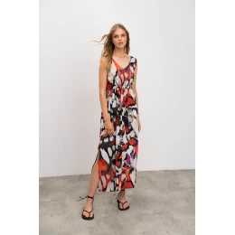 Elegantné vzorované dlhé dámké šaty na ramienka s výstrihom do V. Šaty sú vyrobené z kvalitného viskózového popelínu. Popelín je odolnou, pevnou, ale zároveň mäkkú a na dotyk príjemnou tkaninou, ktorá je vďaka viskóze príjemne chladivá a ideálne pre teplé letné obdobie.