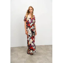 Elegantné dlhé vzorované dámske šaty s výstrihom do V a krátkymi rukávmi, všetko, čo žena potrebuje počas horúcich letných dní. Šaty sú vyrobené z kvalitnej džersejovej viskózy s elastanom. Jersey viskóza sa vyznačuje vysokou savosťou, je dobre priedušná, mäkká a príjemná na dotyk a elastan zaručuje lepšiu pružnosť tkaniny.