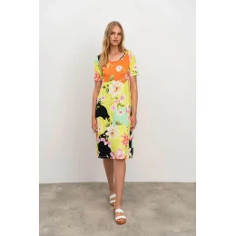 Elegantné dámske šaty s kvetinovým motívom a okrúhlym výstrihom, všetko, čo žena potrebuje počas horúcich letných dní. Šaty sú vyrobené z kvalitnej džersejovej viskózy s elastanom. Jersey viskóza sa vyznačuje vysokou savosťou, je dobre priedušná, mäkká a príjemná na dotyk a elastan zaručuje lepšiu pružnosť tkaniny.