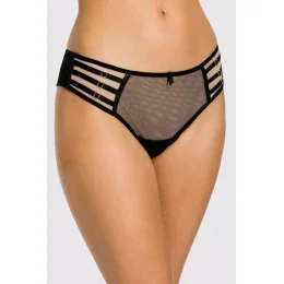 Nezvyčajné podbradníky v štýle podprsenky. Zadná časť z tylu s kosticami, vysoký strih. Boky sú vyrobené z béžového tylu, na ktorom sú našité pruhy so zlatými regulátormi.