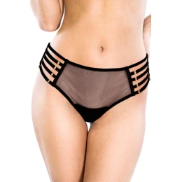 Neobyčajné dámske nohavičky typu brazilky. Pozadie je z dvojitého tylu. Na bokoch nastaviteľné pásky. Krúžky a regulátory majú zlatú farbu.