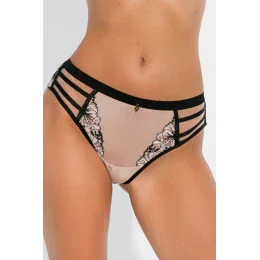 Predná časť z béžového jemného mikrovlákna zdobená výšivkou na bokoch, boky z tylu s našitými čiernymi pruhmi, celá zadná časť s vysokým výstrihom z jemnej kvetinovej čipky.