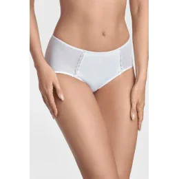 Dámske nohavičky s vysokým pásom, postavené na bokoch. Vyrobené z hladkého mikrovlákna a jemnej tylovej sieťoviny. Prednú časť zdobí všitá čipkovaná stuha a saténové mašličky.
