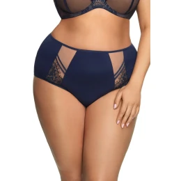 Figi damskie o wyższym stanie.Zabudowany fason zasłaniający prawie całe pośladki.Wykonane z tiulu elastycznego, tiulu stabilnego oraz stabilnej koronki z rzęskami.Skład:90% poliamid, 7%elastan,3% poliester.