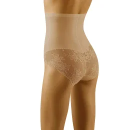Nohavičky s vysokým pásom a čipkovým lemom na zadočku. Tvarujúce línie na bruchu a bokoch. Hladká predná a zadná časť zo špecializovaného úpletu, ktorý jemne zoštíhľuje telo a zlepšuje tvar postavy. Vyšší pás tiež opticky zoštíhľuje oblasť pása, horná časť je z vnútornej strany podšitá silikónom, čo zvyšuje pohodlie bielizne a zabraňuje jej skĺznutiu z tela. Zloženie: 58 % polyamid, 42 % elastan.