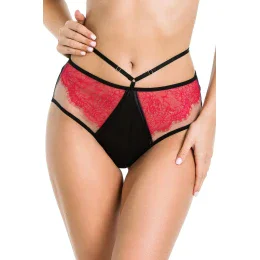 Na bokoch modelu je béžová sieťovina, na ktorú je našitá červená čipka. Zadná časť nohavičiek je podšitá dvojitým tylom. V páse je čierny opasok, ktorého dĺžku je možné nastaviť.