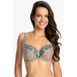Podprsenka Gaia. Model 1097 Lora. Má drôty, ktoré prsia vhodne tvarujú. Zvislé veľrybie kosti zasadené po stranách. Výrobok má nastaviteľné popruhy bez možnosti odopnutia. Kovové háčiky na popruh. Podprsenka so zapínaním na háčiky a oči. Upevňovací bod: vzadu. Výrobok je vyrobený zo 60% z polyamidu, 20% z polyesteru, 15% z elastanu a 5% z bavlny. Výrobok pre ženy.