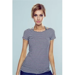 Štýlová blúzka zdobená striebornými gumovými pásikmi v podobe ozdobných trblietavých ramienok. Skvele sa hodí k džínsom, inšpirovaným glam štýlom. Mäkká, pružná bavlna v jemnom bielom a čiernom pruhu.
