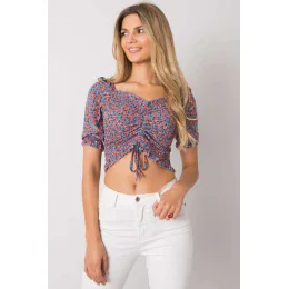 Krátka blúzka vypasovaného strihu s krátkymi rukávmi. Blúzka s véčkovým výstrihom, záhybmi a viazaním na prednej strane.