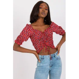 Krátka blúzka vypasovaného strihu s krátkymi rukávmi. Blúzka s véčkovým výstrihom, záhybmi a viazaním na prednej strane.