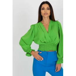 Blúzka s obálkovým výstrihom a dlhými rukávmi. Široká podporná guma v spodnej časti blúzky.
