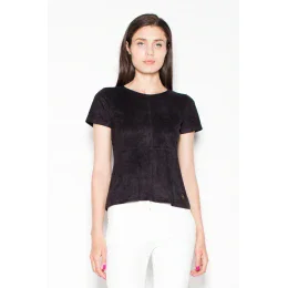 Vzdušná semišová blúzka s krátkymi rukávmi a polkruhovým výstrihom. Ozdobný zlatý zips na zadnej strane. Klasický strih, skvelý na každodenné nosenie.