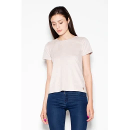 Vzdušná semišová blúzka s krátkymi rukávmi a polkruhovým výstrihom. Ozdobný zlatý zips na zadnej strane. Klasický strih, skvelý na každodenné nosenie.