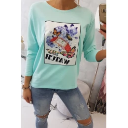 Blúzka s 3D grafikou hodiniek v mätovej farbe