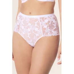 Nohavičky sú vyrobené z jemnej kvetinovej čipky podšitej béžovou sieťovinou, ktorá im dodáva jemnú ľahkosť a estetický vzhľad pri zachovaní plného krytia. Široké zabudované boky poskytujú stabilitu a pohodlie a plochý elastický pás v prednej časti netlačí a zostáva neviditeľný pod oblečením.