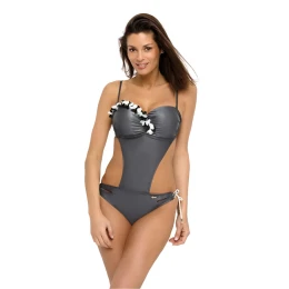 Evelyn M-530 sú jednodielne plavky monokiny. Zdobia ju ručne šité jemné kvety. Horný diel plaviek je tvarovaný vystuženými košíčkami s kosticami a push-up výplňou, ktorá zväčšuje prsia, pozdvihuje ich a zvodne tvaruje. To z nich robí zmyselnú krásku. Push-up výplň nie je z modelu vyberateľná a dodáva sa v každej veľkosti plaviek. Plavky mierne zakrývajú bruško, čo vám dodá pocit sebavedomia. Krásne viazačky na bokoch. Model sa zaväzuje na chrbte a má úplne odnímateľné ramienka. Talianska tkanina, ľahko perleťová, elegantná a krásna. Báječné farby. Jeden z našich favoritov na túto sezónu. Najnovšia kolekcia na leto 2019.