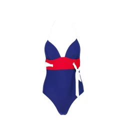 Jednodielne talianskej dámske plavky modro-červeno-biele, sa štrausovými kamienky, košíčky vystužené, bez kostíc, zaväzovanie za krkom.