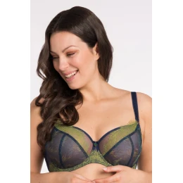 Mäkká podprsenka určená pre ženy so stredným až veľkým poprsím. Poskytuje efekt nadvihnutia a zhromaždenia poprsia do stredu, 3-dielne košíčky zo stabilnej čipky s kosticou a stabilného tylu. Horný okraj košíčkov plynule prechádza do ramienok, čo spôsobuje lepšiu oporu poprsia. Zadná časť z priehľadnej lycry pre veľmi dobré prispôsobenie a oporu. Bočné ramienka zabraňujúce vyhrňovaniu látky. v závislosti od veľkosti dvojradové alebo trojradové zapínanie s trojstupňovým nastavením obvodu. Neodnímateľné, nastaviteľné ramienka v troch šírkach. kovové prvky v svetlo zlatej farbe.