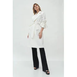 Kabát s dĺžkou ku kolenám, pásikom na zaviazanie v páse, širokými chlopňami a prednými vreckami. Pásky na zaväzovanie v manžetách umožňujú upraviť dĺžku rukávov.