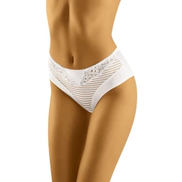 Pohodlné nohavičky mierne vyššieho strihu s elegantne zdobenou prednou časťou. Stehná s hladkým povrchom, zadná časť tiež hladká. Oblasť pása je zdobená jemnou a krásnou čipkou.