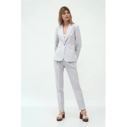 Nohavice s dĺžkou ku členkom, pravidelným pásom, záhybmi na prednej strane, bočnými vreckami, rázporkom na zips a gombíkom. Zúžené nohy so záhybmi.