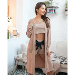 Dlhý kardigán vo farbe inšpirovanej cappuccinom, ktorý úspešne nahradí župan. Vyrobený z rebrovaného úpletu, bez zapínania, s dvoma vreckami na bokoch. Dokonale sa hodí k pyžamám a súpravám Sofia, Mireia, Laida. Zloženie: 62 % polyester, 33 % viskóza, 5 % elastan.