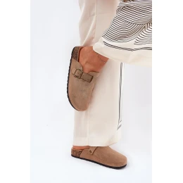 Damskie klapki chodaki na korkowej platformie. Wykonane z eko zamszu. Noski zakryte zapewniają większą ochronę, a klamra umożliwia idealne dopasowanie do stopy. Profilowana wkładka gwarantuje komfort przez cały dzień, dbając o odpowiednie wsparcie. Te klapki będą doskonałym wyborem na co dzień, idealne do casualowych stylizacji, zapewniając wygodę i modny wygląd. Przy wyborze rozmiaru prosimy sugerować się tabelą rozmiarów.