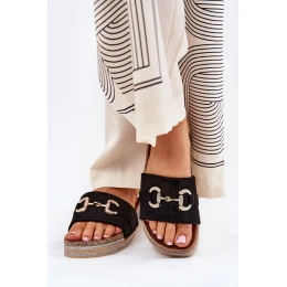 Klapki Damskie Na Platformie Ze Złotą Ozdobą I Brokatem Czarne Morisela