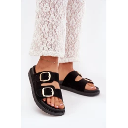 Klapki damskie wykonane z eko zamszu. Osadzone na platformie. Dwa regulowane paski ze złotymi klamrami zapewniają idealne dopasowanie, a profilowana wkładka gwarantuje komfort przez cały dzień. Idealne na codzienne wyjścia. Przy wyborze rozmiaru rosimy sugerować się tabelą rozmiarów.